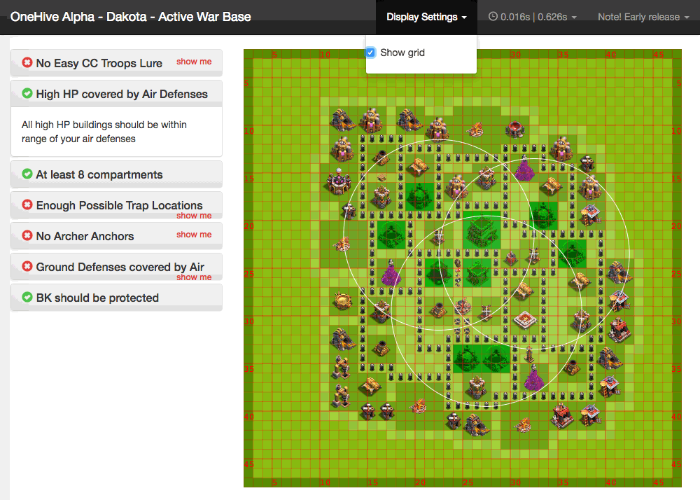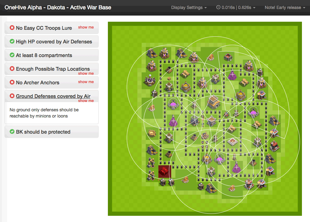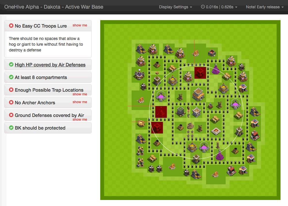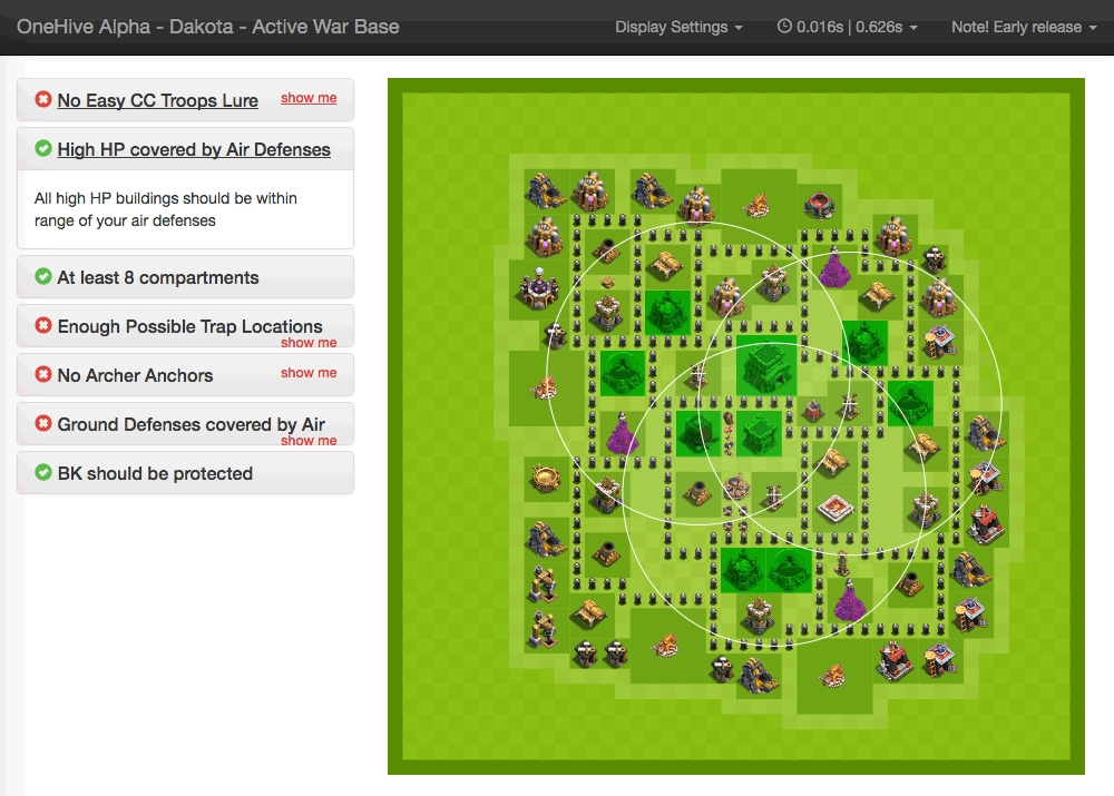 Analyses base layouts against sets of war base rules. It runs this analysis in bulk and provides tabulated results for the current war bases for each member in a clan. Additional to this you can click through to an individual's base to see a more in depth analysis.